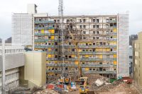 In Vorbereitung auf den Neubau des Funktionsbaus für das Operative Zentrum waren diverse Gebäude rückzubauen: Neben dem Alten Bettenhaus der Chirurgie waren dies der Strahlenbunker der Radiologie, der sogenannte Infektionsbau, der Hörsaal der Chirurgie sowie eine Anlage mit OP-Containern. Das größte Gebäude war das Bettenhaus der Chirurgie mit insgesamt 11 Geschossen und einer Gesamthöhe von 35 m. Die Schwierigkeit beim Abbruch bestand darin, dass die Abbruchstelle im Westen an die in Betrieb befindlichen Operationssäle, im Norden an die Radiologie und im Osten an das mit Patienten belegte neue Bettenhaus angrenzte. Insofern lag der Fokus auf emissionsarmen Abbruchverfahren. Neben den Abbrucharbeiten erfolge im Zuge der Maßnahme auch die Baufeldfreimachung für den Neubau des Funktionsbaus. Im Vorfeld der Neubaumaßnahmen wurden alle Ver- und Entsorgungsleitungen im Bereich der späteren Baugrube unter Aufrechterhaltung der Funktionsfähigkeit umverlegt.
